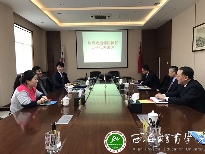 院长周里、党政办主任张朝阳、足球改革发展办公室主任朱军与韩国国民大学体育学院洪俊熙院长一行进行会谈