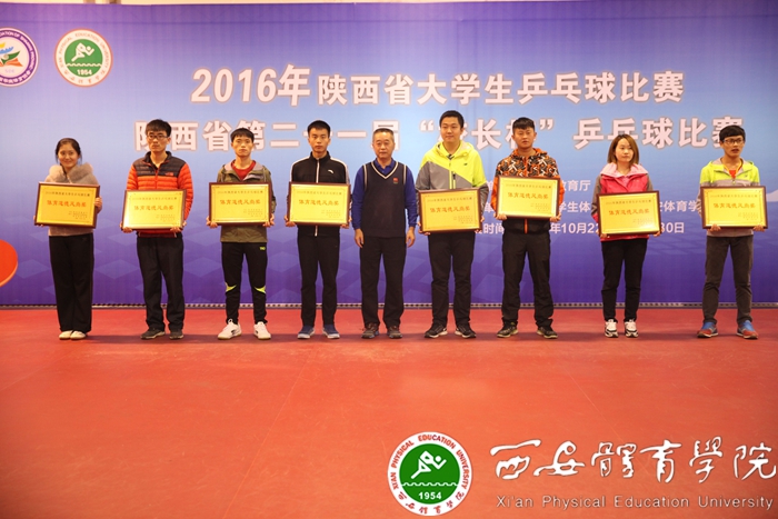 本网讯10月30日下午,由陕西省教育厅主办,省体育协会和我院共同承办的2016年陕西省大学生乒乓球赛在我校综合训练馆落下帷幕。省学生体育协会主席、我院院长周里,本届比赛体育道德风尚奖评选委员黄海,仲裁委员杨亚玲为获奖队伍颁奖,竞训处处长姜涛主持颁奖仪式。