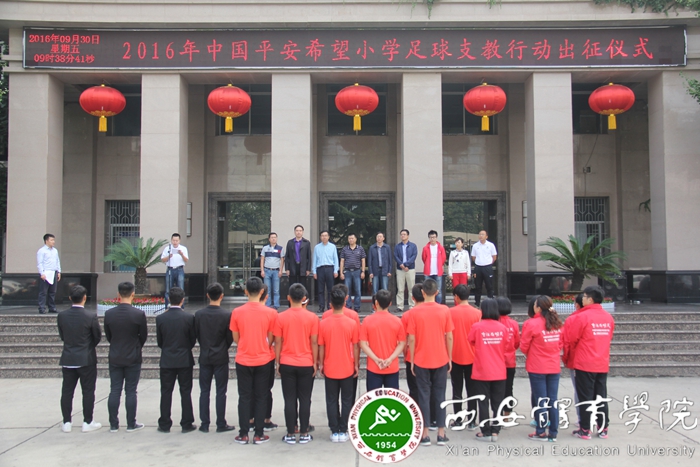 本网讯9月30日上午,2016年中国平安希望小学足球志愿者出征仪式在我院举行。陕西省希望办公室主任、陕西省青少年发展基金会理事长乌钢,中国平安陕西地区支教行动负责人陈毅明,我院党委副书记朱元利以及各职能部门负责人到场为14名志愿者送行。