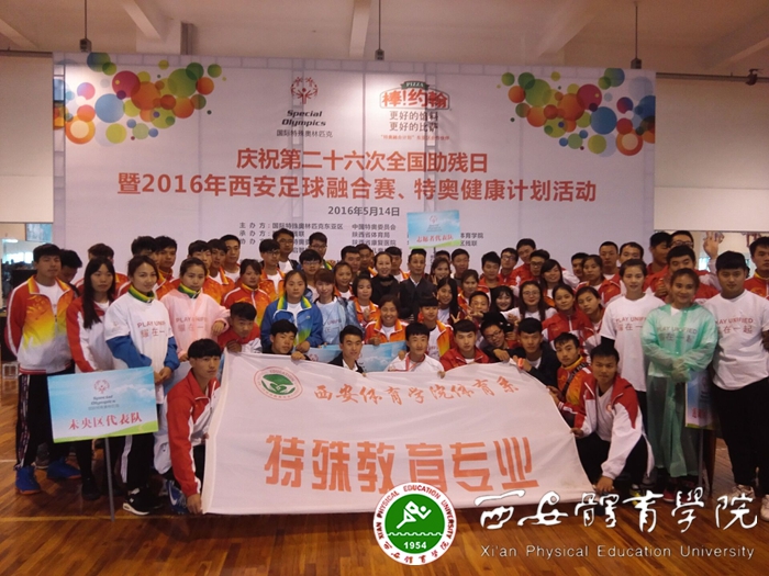 本网讯在第26个全国助残日之际,由国际特殊奥林匹克东亚区、中国特奥委员会主办,陕西省残联、陕西省体育局、西安市残联及必赢nn699net联合承办的“全国助残日暨2016年西安特奥融合计划西安足球融合赛”于5月14日上午8:00在必赢nn699net足球场举行。来自西安市所属县区及儿童福利院的16个代表队共100余名特殊孩子及融合伙伴组成的队伍,冒雨参加了7人制足球融合赛和点球大赛。我院体育教育系特殊教育专业全体同学及体教2013级部分同学,以良好的精神面貌和勇于担当的精神,冒着大雨圆满完成了本次比赛的裁判和志愿者任务。