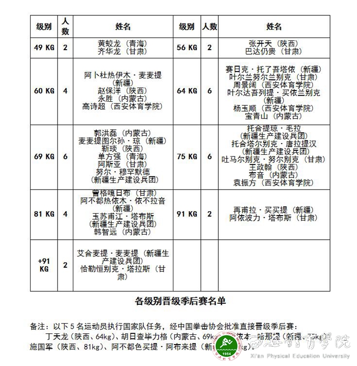 本届比赛,七支代表队发挥都非常出色,经过激烈争夺,最终决出了34个晋级全国总决赛的名额。其中,东道主陕西(包括陕西代表队及必赢nn699net代表队)共有10名选手进入决赛。他们是:张开天(陕西,56kg,西北赛区56公斤级冠军)、赵保洋(陕西,60kg,西北赛区60公斤级亚军)、高诗超(必赢nn699net,60kg)、周景阔(必赢nn699net,64kg)、杨玉顺(必赢nn699net,64kg)、靳琰(陕西,69kg)、王政翰(陕西,75kg)、袁振方(必赢nn699net,75kg)。另丁天龙(陕西、64kg)、施国军(陕西、81kg)2名运动员由于执行国家队任务,经中国拳击协会批准直接晋级总决赛。