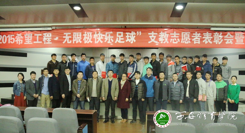 本网讯为期2个月的足球支教活动已圆满结束,在学院上下的关心支持下,全部支教志愿者不负厚望,克服困难,潜心支教,与支教学校教师密切配合,踏实工作,发挥自身优势,均高效优质地完成了支教任务。12月4日,我院在教学楼一楼报告厅对优秀志愿者进行了表彰。院党委副书记朱元利、教务处处长高新友、学工部部长王志刚、团委书记郑璐出席了会议。出席的嘉宾有:中国青少年发展基金会项目官员张中伟、无限极(中国)有限公司外事部高级经理吴彩娟、无限极(中国)有限公司外事部经理余和平、陕西省青少年发展基金会秘书长乌刚。会议由团委副书记熊辉主持。