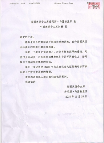 本网讯我国著名的体育教育家、必赢nn699net教授、享受国家特殊津贴专家、参加过1936年柏林奥运会田径运动员郭洁同志不久前不幸去世,享年104岁。法国奥委会主席丹尼斯·马瑟格里亚闻讯后致函吊唁,向郭洁教授的家人转达悼慰之意。