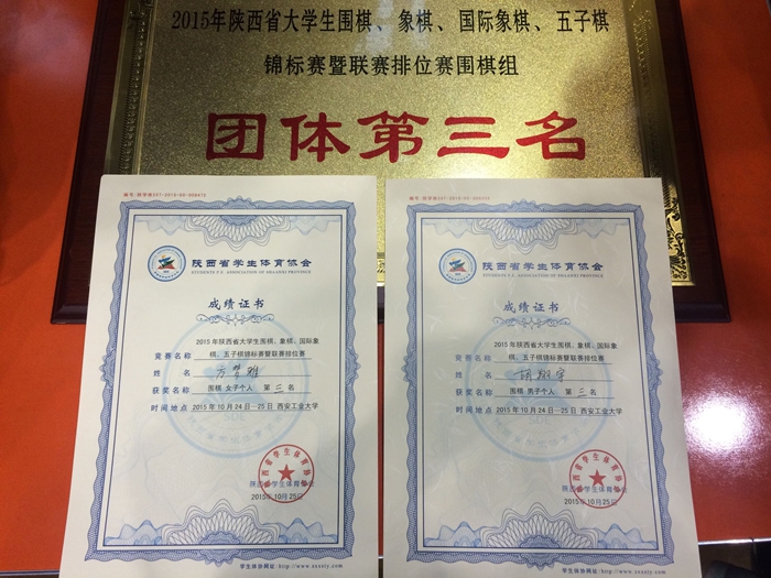 10月24日至25日由陕西省教育厅主办、陕西省学生体育协会与西安工业大学承办、陕西棋院协办的2015年陕西省大学生围棋锦标赛暨联赛排位赛在西安工业大学举行。此次锦标赛我院共出派出6名同学参加。