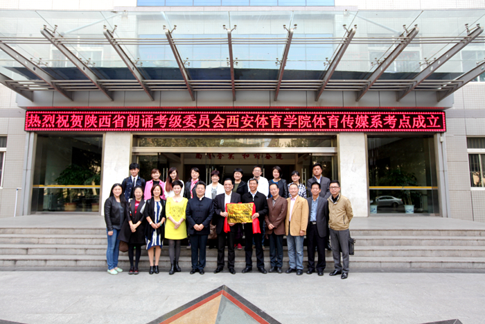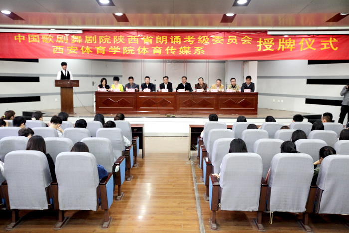 本网讯10月14日,体育传媒系正式获批成为中国歌舞剧院陕西省朗诵考级委员会考点,授牌仪式在新教学楼一楼报告厅举行。原陕西省文化厅副厅长、陕西省文化交流协会副会长王小康,陕西省播音主持委员会副会长、播音指导、著名电视主持人、中国歌剧舞剧院陕西省考级委员会主任严一宁,中国文化艺术教育家协会副会长、中国歌剧舞剧院陕西省考级委员会副主任张晨等众多领导专家莅临现场,副院长文立新出席会议并讲话,严一宁为大会致词。