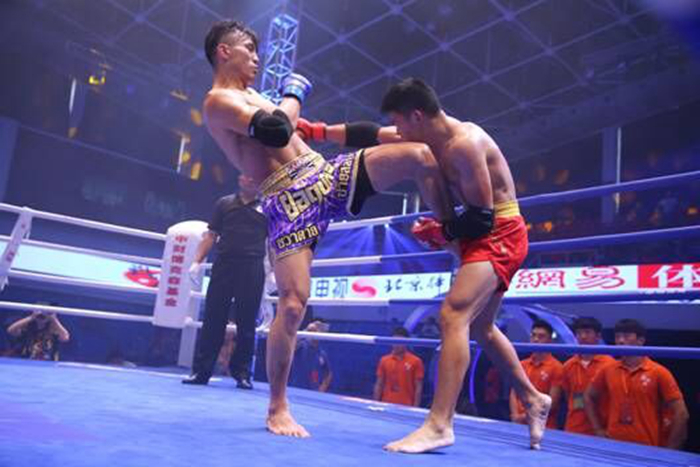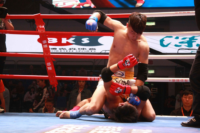 85公斤级的决赛作为压轴战,是在北京体育大学的张继凯与我院的青格乐之间展开。第一回合,青格乐便充分展现出全面的特点,无论直立还是地面都占据优势,张继凯完全落得下风,不过两次被击倒之后的张继凯在观众的助威声中两次顽强站起来,坚持完成第一回合。第二回合一上来,青格乐又是拳脚并用,张继凯的教练只好丢白毛巾认输,青格乐便以TKO获胜锁定冠军。