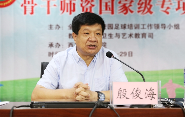 殷俊海以《青少年校园足球政策解读》为题为大家详细解读了校园足球的相关政策。殷俊海副司长结合当前国际国内足球项目发展形势,从中国改革为什么从足球开始、校园足球的使命、青少年校园足球政策三个方面为参训学员做了深刻解读。他强调,要深入贯彻落实国务院发展足球事业的整体部署,以深化教育综合改革为动力,以广泛开展足球教学训练活动和建立健全四级联赛体系为重点,以加强师资队伍建设为基础,以完善政策措施和加大投入为保障,坚持因地制宜、坚持重点突破与整体推进相结合,着力开创校园足球工作新局面。