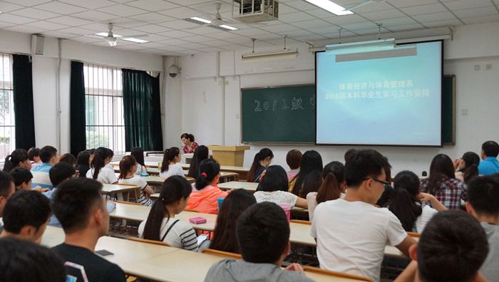 本网讯6月29日下午,体育经济与体育管理系召开实习生动员大会。参加本次大会有系党总支书记智勇、系副主任党挺、辅导员及2012级全体同学。