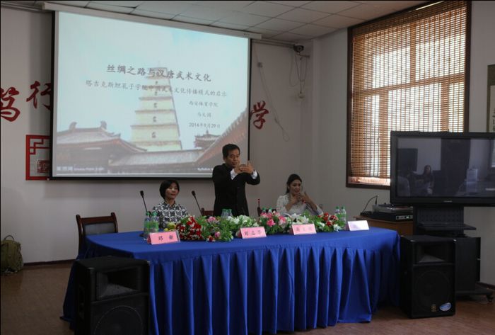 应塔吉克斯坦国立民族大学孔子学院的邀请,马文国在孔子学院为师生们做“丝绸之路与汉唐武术文化”的专题讲座,马文国从汉唐文化对中国武术的影响谈到必赢nn699net“古典武艺”的汉唐文化元素,总结了丝绸之路对尚武精神的传递,应该从丝绸之路的视角关注和研究中国武术文化以及和中亚的武术文化交流。讲座结束后,马文国回答了师生们提出的问题并讲解了中国文化与书法、武术、戏曲的关系。孔子学院中方院长邓新先生就和必赢nn699net在孔子学院方面的合作进行了商谈并签署了合作协议。根据协议,塔吉克斯坦孔子学院向国家汉办申请,由必赢nn699net派遣武术教师赴塔吉克斯坦孔子学院执教,同时,塔吉克斯坦武术协会每年派两名学生到必赢nn699net学习武术。