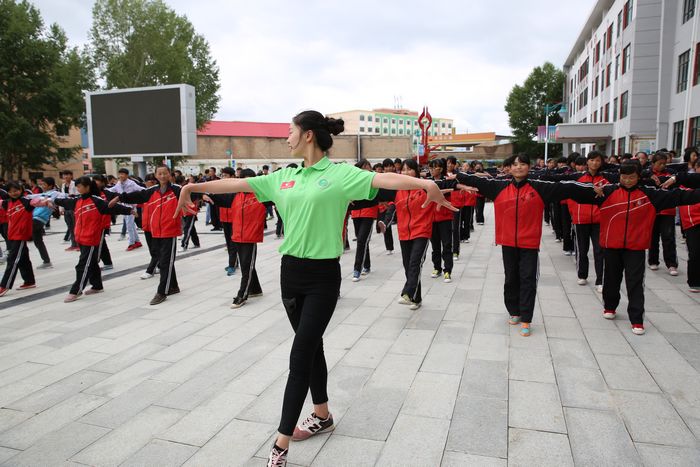 我院“赴青海体育艺术表演团” 作为省级重点团队把精心编排的极具体育特色的艺术表演深入社区、学校、部队等地进行演出,先后来到海北州武警支队、海晏县寄宿制民族小学、西海镇奥凯文化广场、祁连县民族中学、祁连县消防中队、祁连县八宝镇新城区广场、门源县青石咀寄宿制小学、门源县初级第一中学、门源县浩门镇文化广场、门源县消防大队进行了10余场演出。在学校和广场演出期间,啦啦操、竞技健美操、艺术体操、花式篮球、武术等极富体育特色的表演赢得师生和当地群众的阵阵喝彩。演出结束后,志愿者与师生、群众进行互动,他们在志愿者的编排和教授下,学习啦啦操、武术、拉丁舞等体育特色项目。志愿者们以他们精湛的表演,良好的精神风貌完美诠释了体育人永不言弃、勇往直前的体育精神。