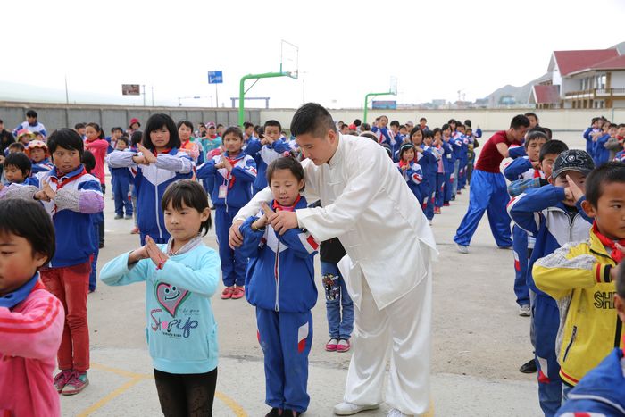 志愿者向海晏县寄宿制民族小学的学生教授普通话