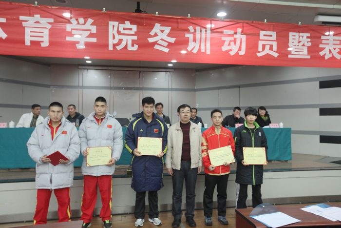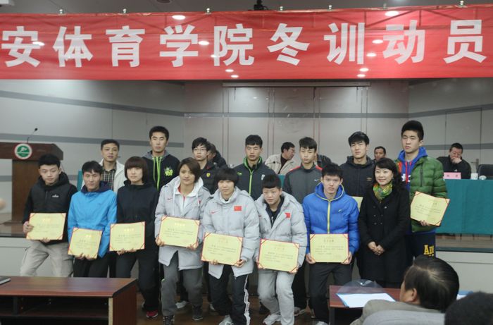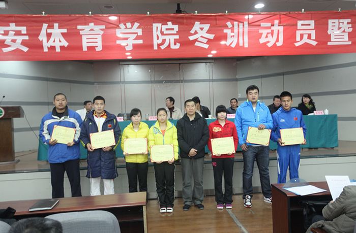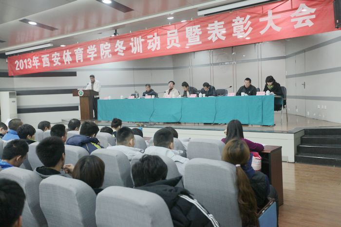 本网讯12月18日,2013年度学院冬训动员暨表彰大会在教学楼一楼报告厅召开。陕西省体育局副局长董利、陕西省体育局科教处处长陈亚民、我院党委副书记朱元利、学院相关处室负责人、竞技体育学校(拳跆中心)全体教练员、运动员、工作人员以及国家青少年竞走队全体教练员、运动员参加了会议。会议由竞技体育学校党总支书记樊康主持。
