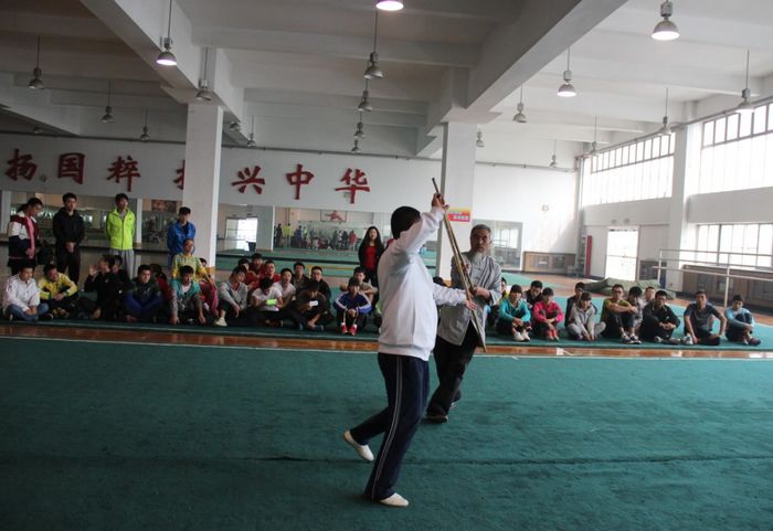 天齐棍是西北四大名棍之一,具有浓郁的地方特色,也是“西棍”典型代表。杨学海先生研习天齐棍法多年,对其理论和技术有独到而精深的见解。他首先系统讲解了自己的师承和天齐棍的“轮子”和“折子”以及特点,随后在训练馆演示了天齐棍法。杨学海先生今年64岁,其敏捷多变的身法,疏忽纵横的棍法表现出的深厚功力,使在场师生大呼过瘾,掌声不断。