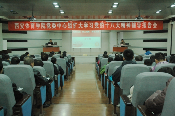 本网讯 为促进广大党员和师生深入学习、深刻领会党的十八大精神,11月26日下午,党委中心组扩大学习党的十八大精神辅导报告会在教学楼一楼报告厅举行。报告会邀请陕西省教育系统党的十八大精神宣讲团成员、陕西师范大学党委宣传部长孔祥利教授作了题为《辉煌成就 伟大道路 科学发展》的精彩报告。全院处科级干部、党支部书记、全体辅导员、思政教研部全体教师、党委职能部门及纪检部门全体干部200余人参加了学习。报告会由纪委书记、党委副书记苏义民主持。