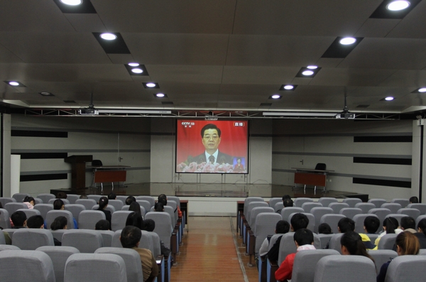 本网讯11月8日上午,中国共产党第十八次全国代表大会在北京召开,我院组织党员干部师生在教学楼一楼报告厅和行政楼二楼大会议室集中观看大会开幕式直播。