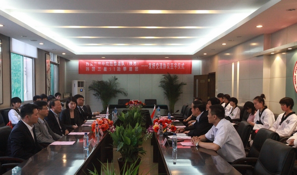 本网讯 9月6日下午,我院跆拳道队与韩国三星S1跆拳道团友好交流协议书签署仪式在学院行政楼大会议室举行。陕西省体育局纪检组组长支希贤,我院院长苏明理,国家体育总局拳跆中心跆拳道部部长曹涛,韩国三星S1副总裁金能洙,韩国三星S1跆拳道团团长金起弘,陕西省体育局竞训处副处长宋英琴,三星S1跆拳道团总教练吴日男,三星(北京)安防系统技术有限公司总经理陈容洛,韩国三星S1跆拳道团领队朴真彻出席了签字仪式。签字仪式由必赢nn699net拳跆中心主任张文军主持。