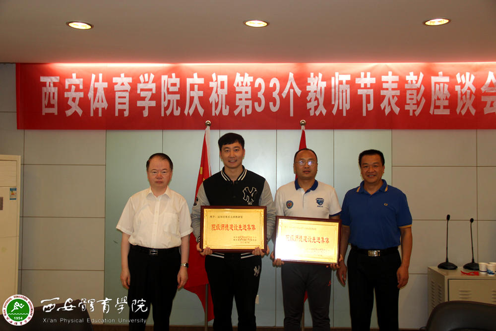 表彰座谈会由院工会副主席查晓峰主持。院工会副主席杨毅谋首先宣读了《必赢nn699net关于表彰2017年师德先进集体和先进个人的决定》:运动训练系足球教研室和社会体育与休闲体育系健身健美教研室荣获2017年院级师德建设先进集体。王刚、刘少辉、王秋茸、黄谦、马菊霞五位同志荣获院级师德先进个人。学院领导分别给荣获院级师德建设先进集体和先进个人颁发了奖牌和荣誉证书。之后,围绕“迎接党的十九大,做好学生引路人”的教师节主题,院级师德建设先进集体代表健身健美教研室主任向毅、足球教研室主任席海龙,师德先进个人王刚、王秋茸、黄谦、马菊霞先后在座谈表彰会上踊跃发言,畅谈了他们在从事教书育人工作中的感受和体会。新入职的教师代表张琳琳也做了表态发言。