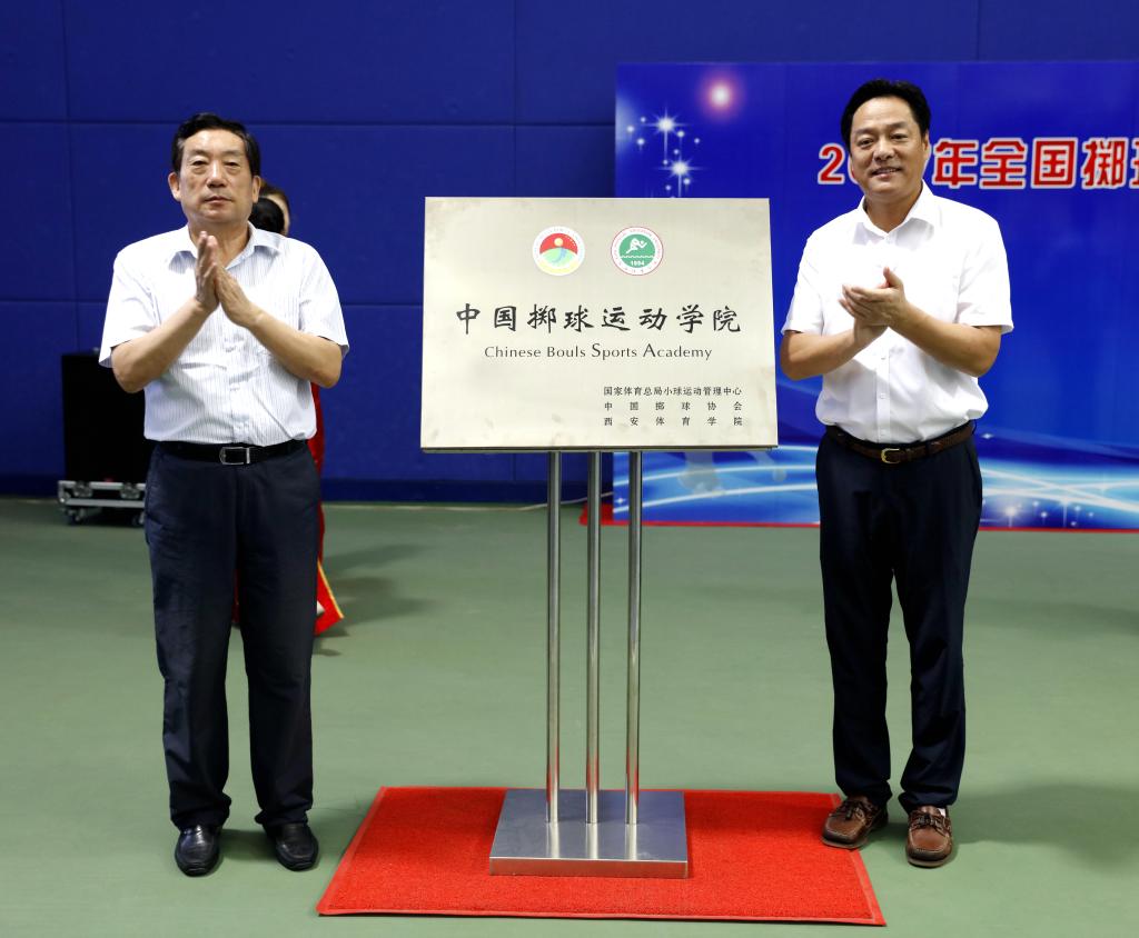 王立伟与陕西省体育局局长姚金荣为“中国掷球运动学院”揭牌