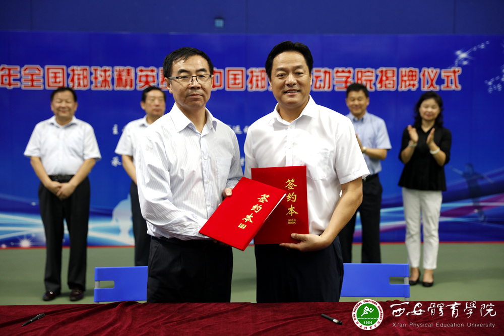 紧接着进行了“中国掷球运动学院”签约暨揭牌仪式,王立伟主任和朱元利院长代表双方签订了“中国掷球运动学院”合作协议书并由王立伟主任和姚金荣局为“中国掷球运动学院”揭牌。最后,王延梅同志代表中国掷球协会向我院赠送冠军奖杯。