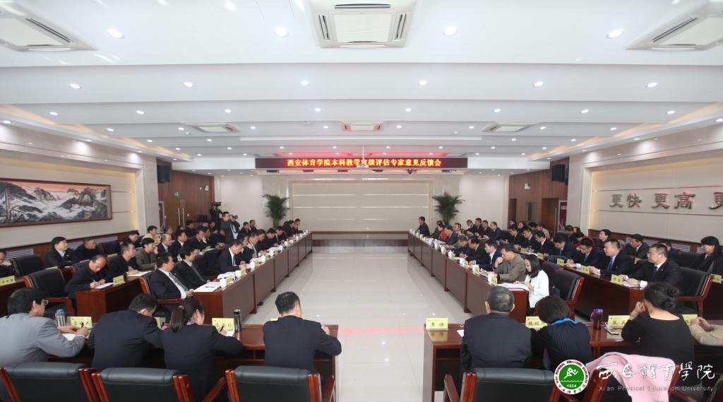本网讯 10月26日下午,我院本科教学工作审核评估专家意见反馈会在新网球馆六楼报告厅召开。教育部审核评估专家组杨桦、骆秉全、于剑、刘茂平、景丽英、张新民、季浏、陈作松、宁维卫,陕西省教育厅副厅长、省高等教育局副局长王紫贵,省体育局副局长徐鹏,省教育厅高教处长胡海宁,西部评估中心副主任徐菲,我院党委书记吴长龄、院长朱元利及其他院领导出席了反馈会。全院正处级以上干部、正高职称教师、学术委员会委员、教学指导委员会委员、学位委员会委员共119人参加了会议。反馈会由专家组副组长骆秉全主持。