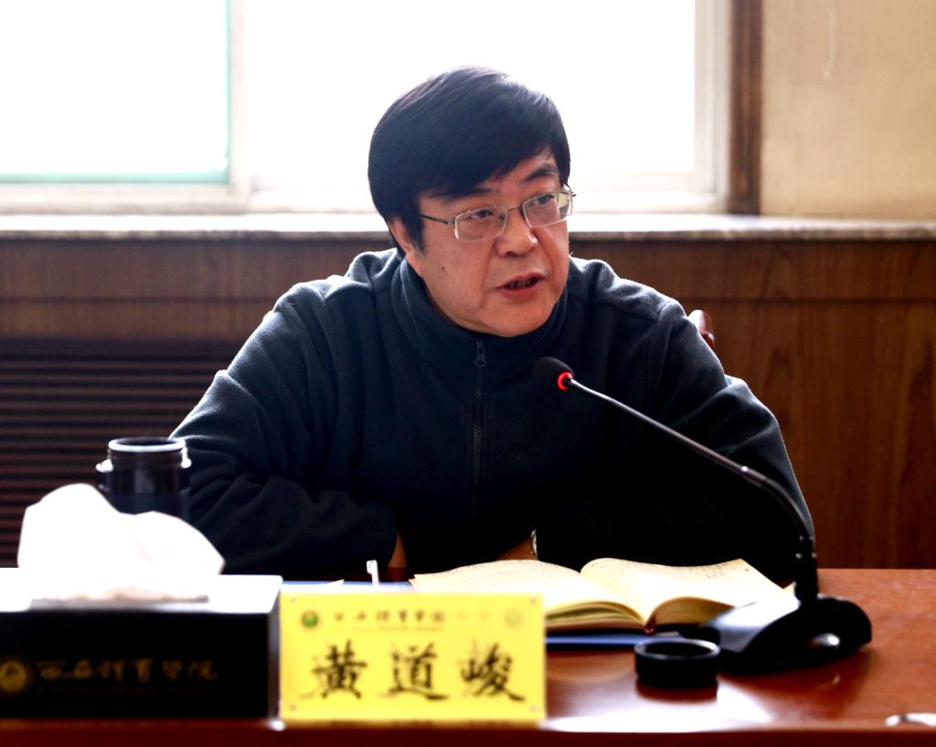 黄道峻首先就我校主题教育开展以来取得的成绩表示肯定,并结合自己在沣峪校区、鄠邑校区、武术学院等四个单位调研的情况和列出的40条问题整改清单,向大家阐释了主题教育“五个具体目标”的涵义。他表示,目前主题教育处在奋发有为抓落实的攻坚阶段,各二级单位要从以下几个方面解决主题教育是否有实效的问题:一是理论学习是否学深悟透,是否存在学用脱节的问题;二是基层党支部开展学习是否存在落实上的虚化弱化问题;三是列出的问题清单是否停留在表面,没有具体落实解决;四是是否解决了党委班子、校级领导班子、二级学院班子以及支部和行政管理职能部门不担当不作为的问题。他指出,处级干部轮岗以来大家增强了责任意识和使命担当,学校的整体面貌发生了很大变化,各二级单位领导班子要通过主题教育学习,始终坚持“四个贯穿始终”,将“五个具体目标”作为检验工作是否有成效的标准和底线,切实提升政治素养和干事创业的担当精神,提高二级党委的威信力和凝聚力。