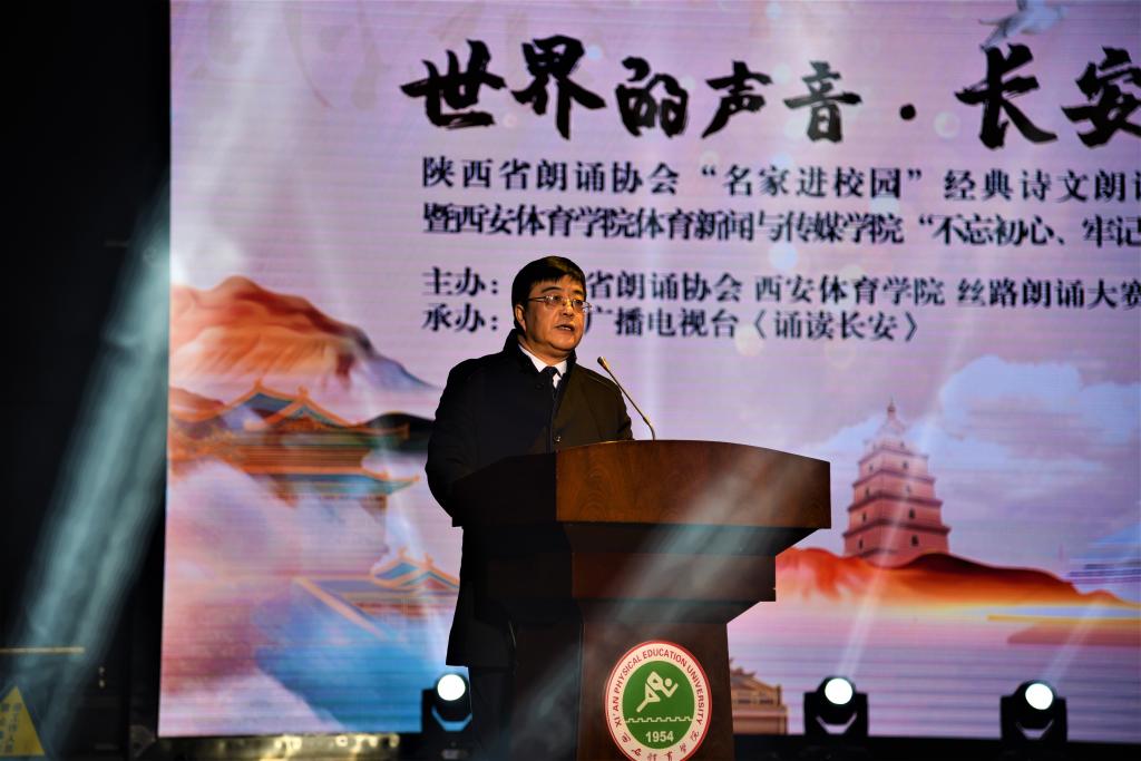 黄道峻在致辞中表达了对陕西朗诵艺术家们的欢迎,他表示,“名家进校园”经典诗文朗诵会活动通过诵读经典作品,引领西体青年学生提高审美修养,提升精神境界,增强文化自信,满足了青年学生精神文化生活需求,本次活动是朗诵艺术与丝路文化的完美碰撞,是“立德树人”的实际体现,是“文化自信”的有力展示。