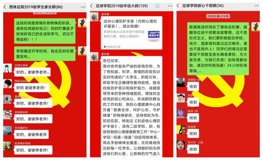 辅导员全方位做好管理工作——足球学院辅导员无论身在何地、人在何方,始终贯彻落实好学院要求,从疫情通报到防护引导,从信息摸排到危机防控,从心理支持到学业生活帮扶,始终把学生的管理工作放在首位。