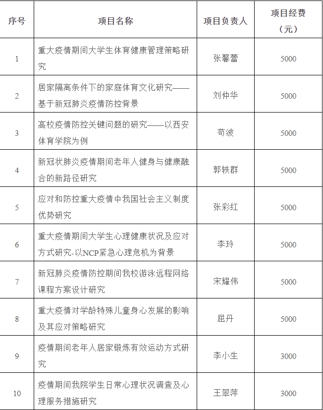 贯彻落实国家体育总局部署要求。科研处积极应对项目申报工作,建立应急反馈沟通机制,按类型认真梳理、分层次广泛动员,提高申报质量。在国家体育总局“健身科普微视频”征集活动中,我校共推荐健身视频作品5项,其中武术学院罗雪琳老师的《居家适宜运动小方法》在国家体育总局科普微视频专栏中推出,为帮助人民群众做好居家期间的科学健身工作,打赢本次疫情攻坚战起到了积极作用。