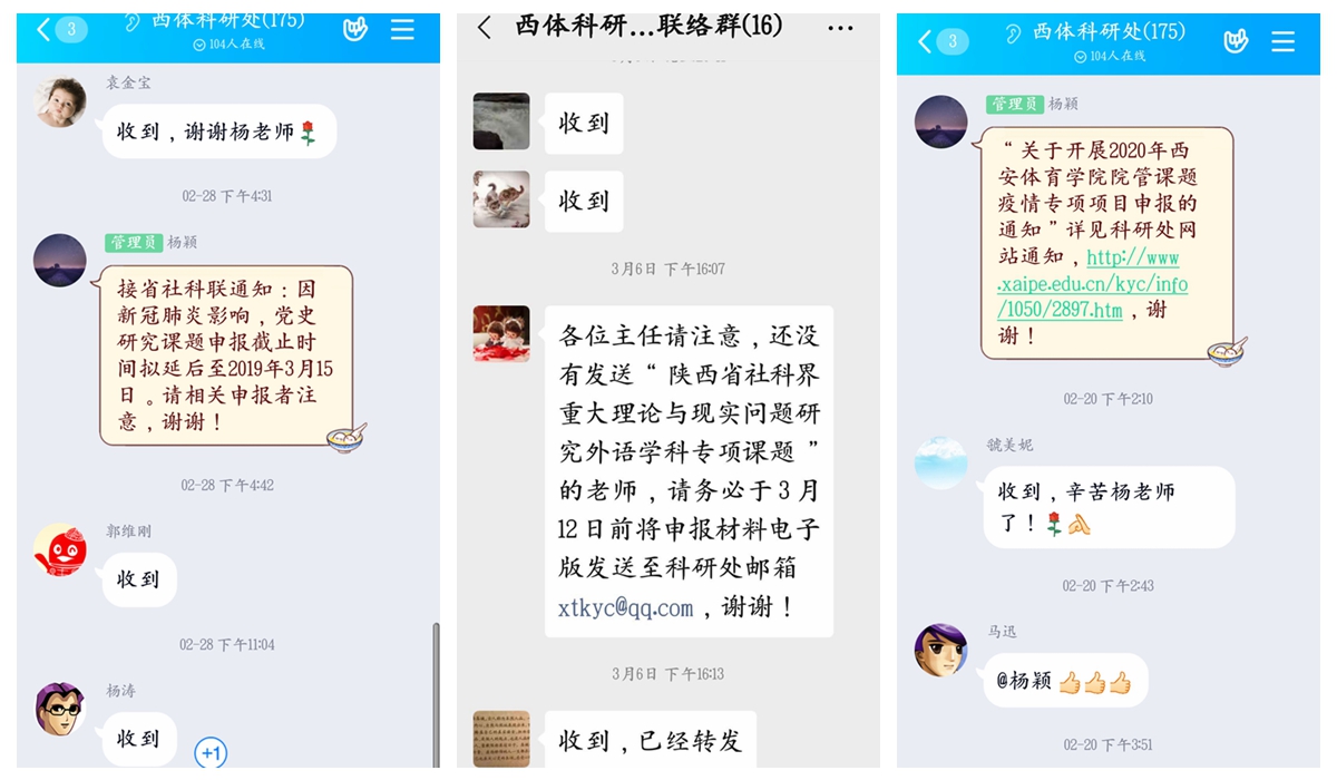 加强科研工作宣传引导。疫情防控期间,科研处统筹调整做好值班工作,最大程度减少人员聚集,进一步加强科研信息化管理,充分利用学校网站、电子邮箱、QQ群、微信、电话沟通等方式对各类科研工作进行宣传。针对教育部、全国哲学社会科学工作办公室、陕西省社科联等发布的各类计划项目延迟申报通知,及时调整校内相关科研工作安排,制定各类申报事项专属工作方案,确保我校科研工作有序开展。