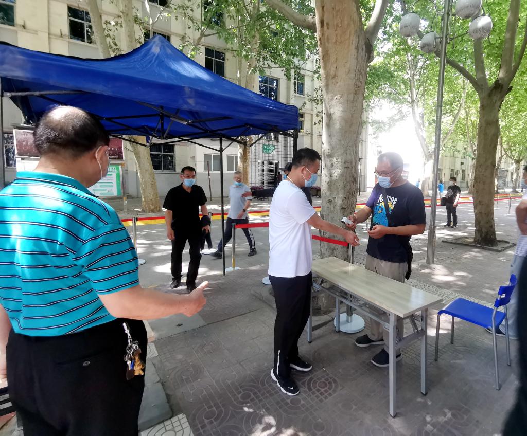 演练人员保持1.5米间距并进行体温检测后进入教学楼