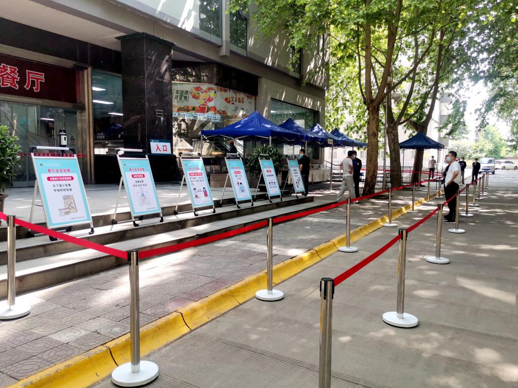 演练人员保持1.5米间距并进行体温检测后进入餐厅