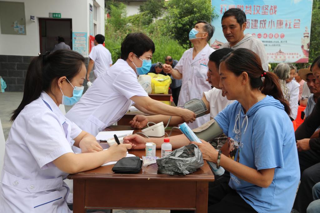 原来,他们早早等候在村委会,是在迎接我校运动创伤医院的医疗下乡服务团队。该团队由运动与健康科学学院党委书记刘勇、校医院副院长陈鹏、教学实验医院内科、外科、骨伤科、眼耳鼻喉科及护理等8名医务人员组成,携带了超声、心电图、血糖仪等重要仪器设备,为村民进行健康扶贫义诊活动。