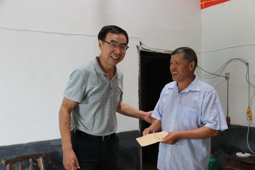 走访的第一户是谢坝村二组组长、建档立卡户谢永兴家。去年谢永兴的妻子检查出了癌症,通过合疗报销、大病保险、低保报销、建档立卡户的救助政策,帮助他的妻子解决了95%的医疗费用和每月将近1万元的化疗费用。校领导为谢永兴送上慰问金,原本就腼腆寡言的谢永兴更加手足无措,一个劲儿的向大家点头致谢。