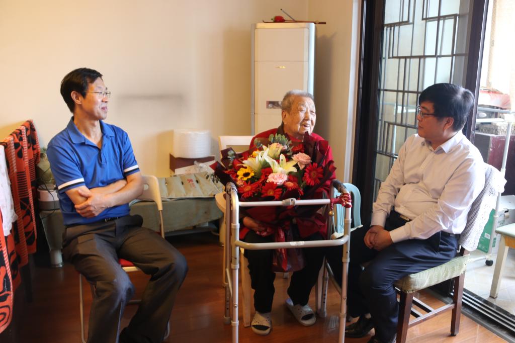 本网讯 在中国人民抗日战争暨世界反法西斯战争胜利75周年纪念日到来之际,9月1日,校党委书记黄道峻、副校长刘新民在党委(校长)办公室、离退休处工作人员的陪同下,走访慰问了抗日战争时期参加革命工作的王哲同志。