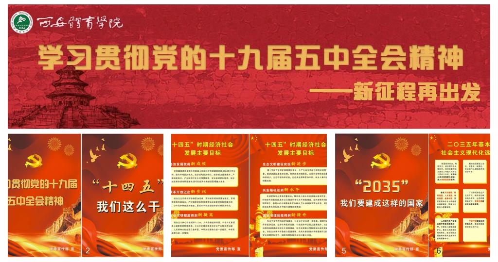校园网及时更换首页宣传图、刊登十九届五中全会会议公报,开设“十九届五中全会精神”专题网页;微信公众号平台转载多期解读十九届五中全会内容的文章、图片;校园广播持续宣传报道十九届五中全会相关内容,并制作了独具特色的宣传片花;宣传橱窗更换了11块展板,在校史馆新增20块展板,供师生学习交流。