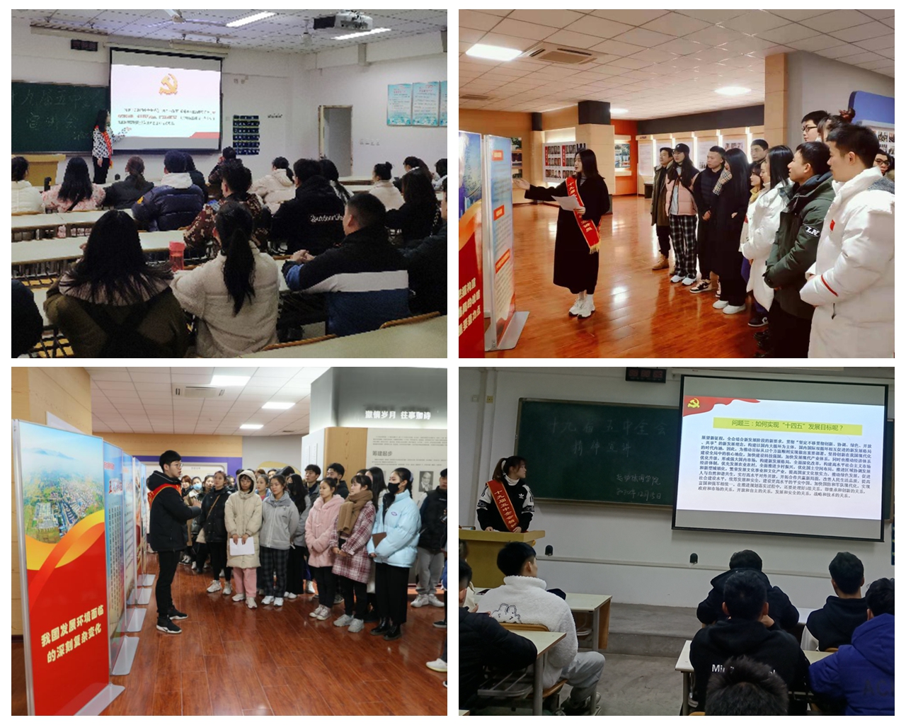 12月中下旬,各二级学院相继开展宣讲活动。学生宣讲员深入学习,精心准备,采用PPT展示、提问互动、参观校史馆等形式,为所在院(部)的学生解读“十四五”规划和2035远景目标。同龄人讲给同龄人听的方式,深受学生喜爱。学生讲解员把理论话语转化为通俗易懂的生活话语,让大家更加了解建设文化强国、教育强国、体育强国、健康中国与普通学生的关系,进一步提高了学生的思想意识和政治站位。自12月10日至18日在校内共宣讲了11场,听讲对象有团支部书记、学生干部、入党积极分子、学生代表等1500多人。