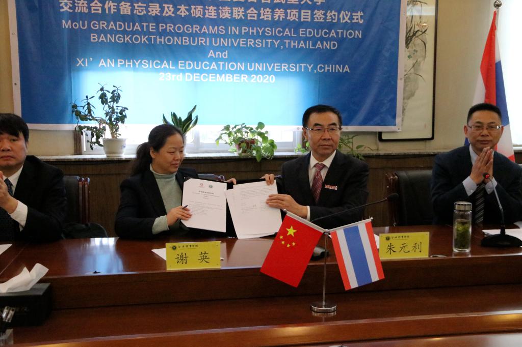 朱元利和BangonBenjathikul博士在签约仪式上分别致辞。朱元利指出,曼谷吞武里大学是一所泰国教育部管理的著名综合性大学,是泰国办学层次以及专业设置较为齐全的大学之一,学历受中国教育部及世界认可。尤其是体育学科专业实力雄厚,具有广泛影响力,近年来积极参与“一带一路”建设,与我国多所专业体育院校建立交流合作关系,广泛开展体育人才培养、体育科研交流、体育文化传播等合作。此次两校在相互尊重、互信互助、携手发展的基础上,成功签署交流合作备忘录及“本硕连读联合培养”项目,是两校基于友好交往、着眼未来发展,充分落实优质资源共享,共同推进办学发展共识所形成的重要成果,也是我们两校为中泰两国在文明互鉴、文化互融道路上持续发展所做出的努力和贡献。