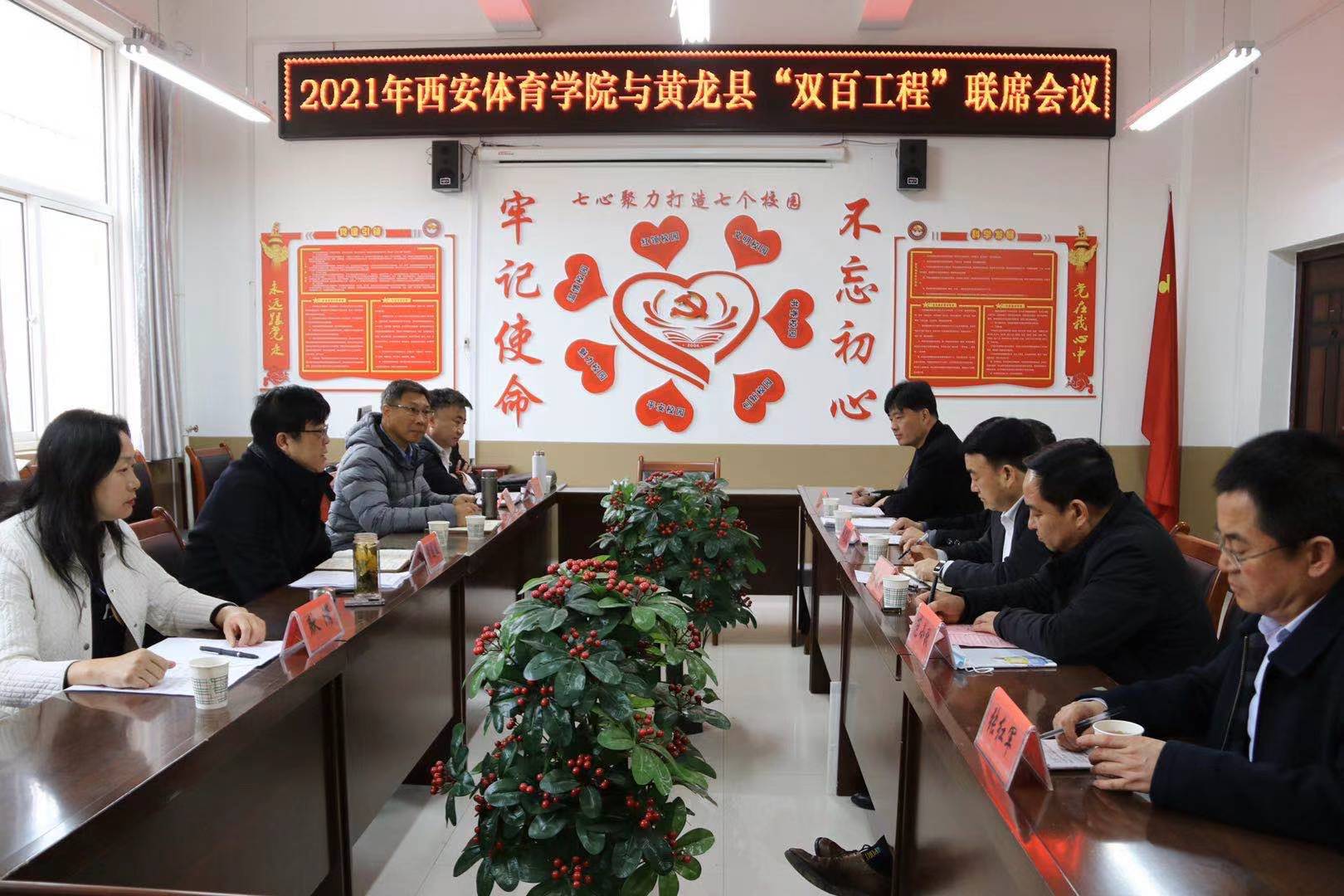 捐赠仪式结束后,双方举行了“双百工程”联席座谈会,就乡村振兴战略进行了交流。黄道峻表示,自2017年与黄龙县开展结对帮扶以来,我校认真贯彻落实国家和省委脱贫攻坚相关会议和文件精神,坚持把“双百工程”作为一项政治任务列入年度工作要点,通过找准黄龙县实际需求与我校体育教育、运动训练、群众体育、体育产业、科研支撑的结合点,以体育院校特色、优势资源为杠杆,多渠道为黄龙县经济社会发展提供帮扶,书写了体育助力脱贫攻坚的高校样本,被省委教育工委、省教育厅评为2019年度“双百工程”先进单位。2021年对学校而言是充满挑战和希望的一年,学校仍将克服困难,为黄龙县乡村振兴、全民健身等事业提供力所能及的帮助,接续推进脱贫攻坚与乡村振兴有效衔接,为全面决胜建成小康社会作出更大的贡献。