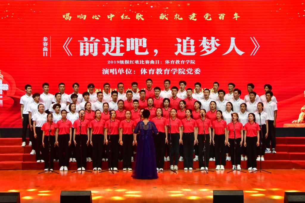 体育教育学院党委合唱团演唱的《前进吧,追梦人》,表达了在国家建设的道路上,年轻一代追梦人无限接近中华民族伟大复兴目标。