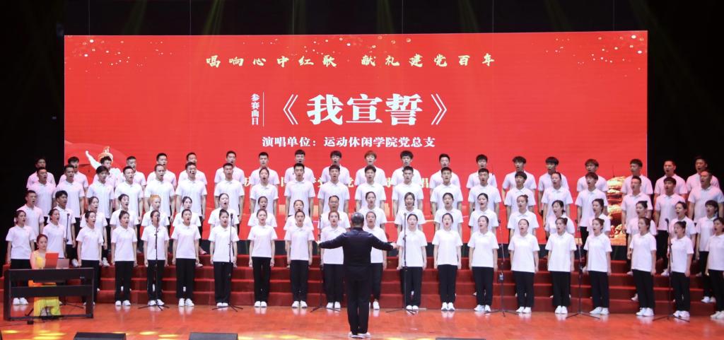 青春活力的运动休闲学院党总支合唱团,在动作、灯光效果相呼应下演唱《我宣誓》,唱响了每位党员的坚定信仰与对党深沉无限的爱。