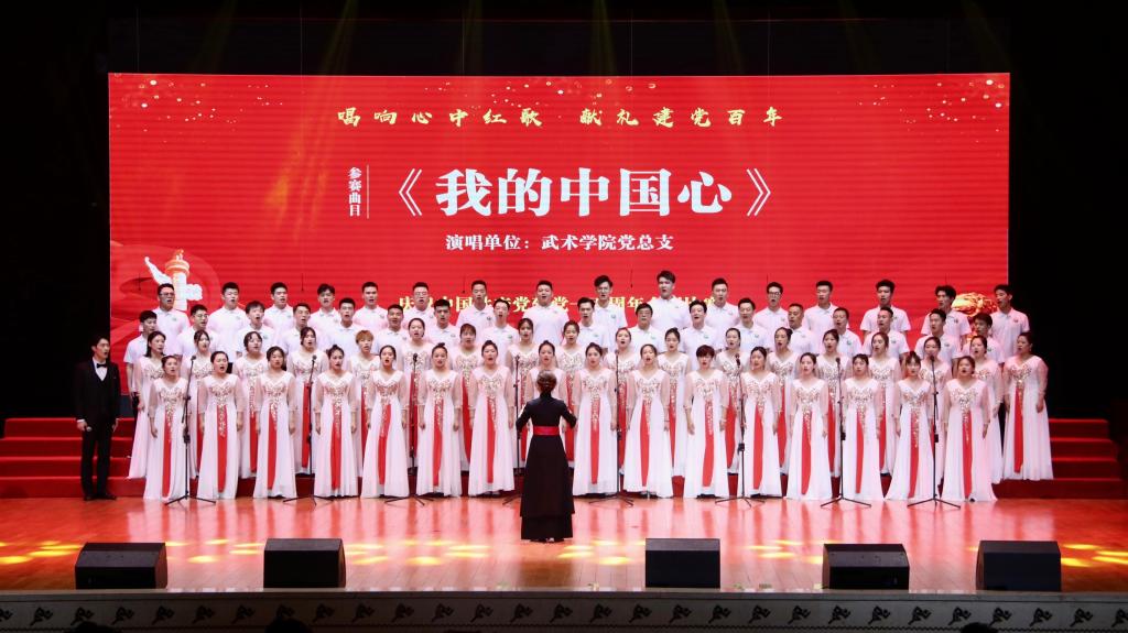 武术学院结合传统武术表演,深情演唱《我的中国心》,直抒胸臆,向祖国母亲表达最深情的爱。