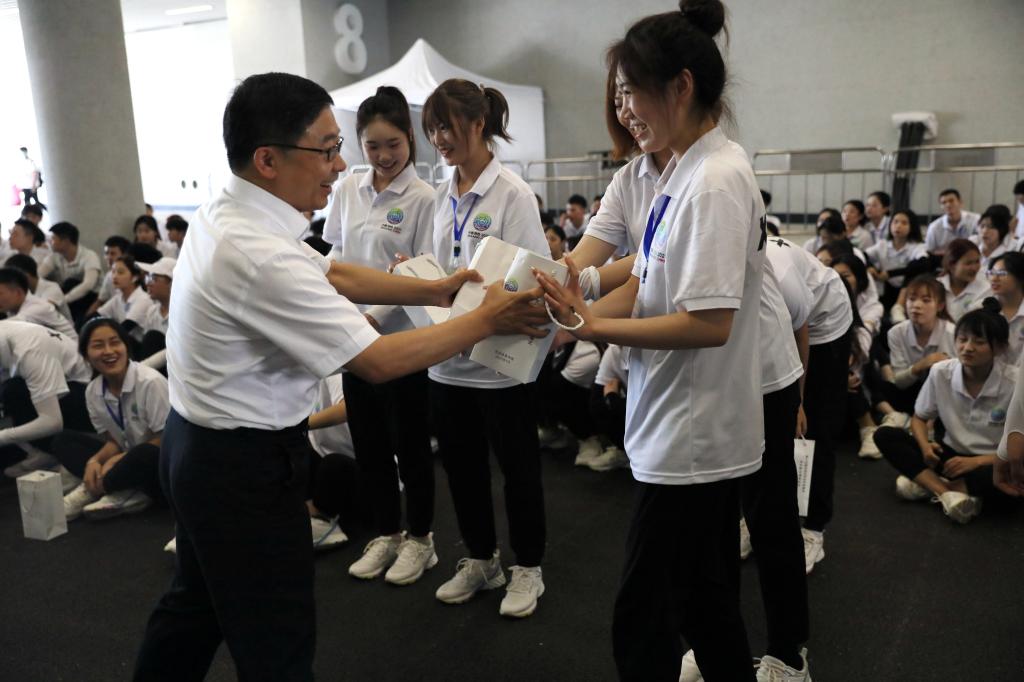 本网讯 7月30日下午,校长刘子实、党委委员张朝阳前往西安奥体中心看望慰问我校228名十四运会开闭幕式学生群众演员和管理教师,为演职人员送上慰问品。党委与校长办公室主任张军、艺术学院院长杨占军、艺术学院党委书记丁雪艳、校团委书记熊辉等陪同慰问。