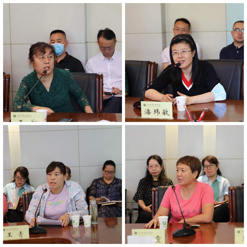 教师代表张英、潘玮敏、王青、杨柳霞发言