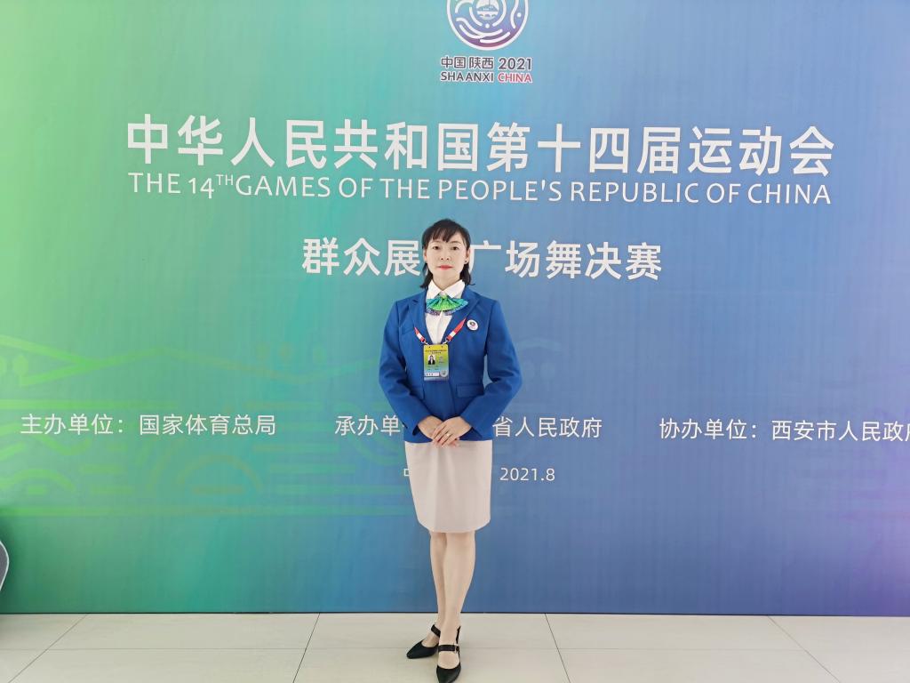 王硕2005年留校任教至今,主要从事健美操、团体操的教学与研究工作。在这次第十四届运动会群众赛事活动广播体操项目中,担任教练员,所负责的陕西省西安市碑林区黄雁社区队最后也获得了团体赛城市街道组一等奖和网络评选最佳人气奖。