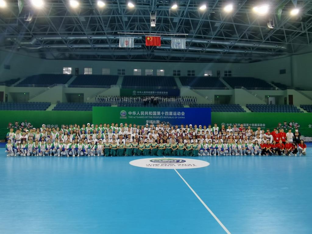 本网讯 9月12日,中华人民共和国第十四届运动会手球比赛在必赢nn699net鄠邑校区手球馆圆满落幕。共有来自江苏、陕西、安徽、辽宁、天津、上海、北京、山东、广东等地,男女共16支参赛队伍争夺两项金牌。