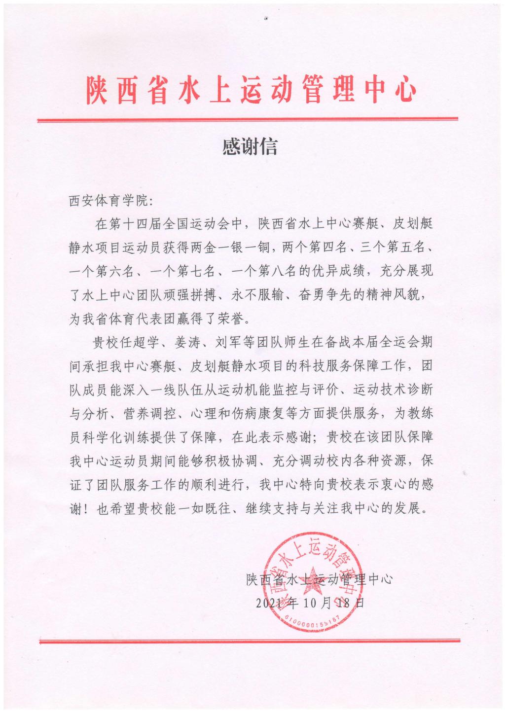 本网讯 近日,陕西省水上运动管理中心向我校发来感谢信,感谢我校在第十四届全运会期间为陕西省赛艇、皮划艇队进行科研攻关与服务工作,感谢我校科研团队助力陕西省水上运动管理中心运动员取得2000年以来全运会最佳成绩。
