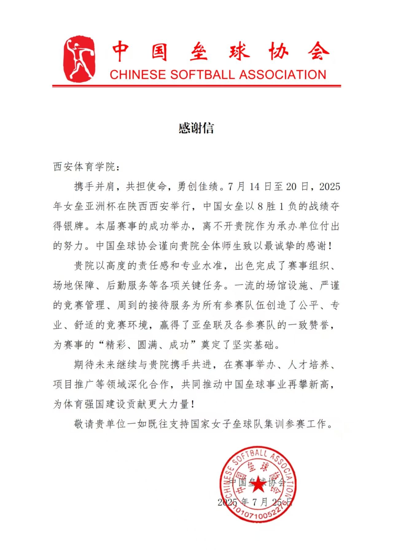 本网讯 近日,中国垒球协会向我校发来感谢信,对2025年女垒亚洲杯举办期间,我校作为承办单位出色完成赛事组织、场地保障、后勤服务等工作表示诚挚感谢,向为赛事圆满举办付出努力的我校全体师生致以崇高敬意。