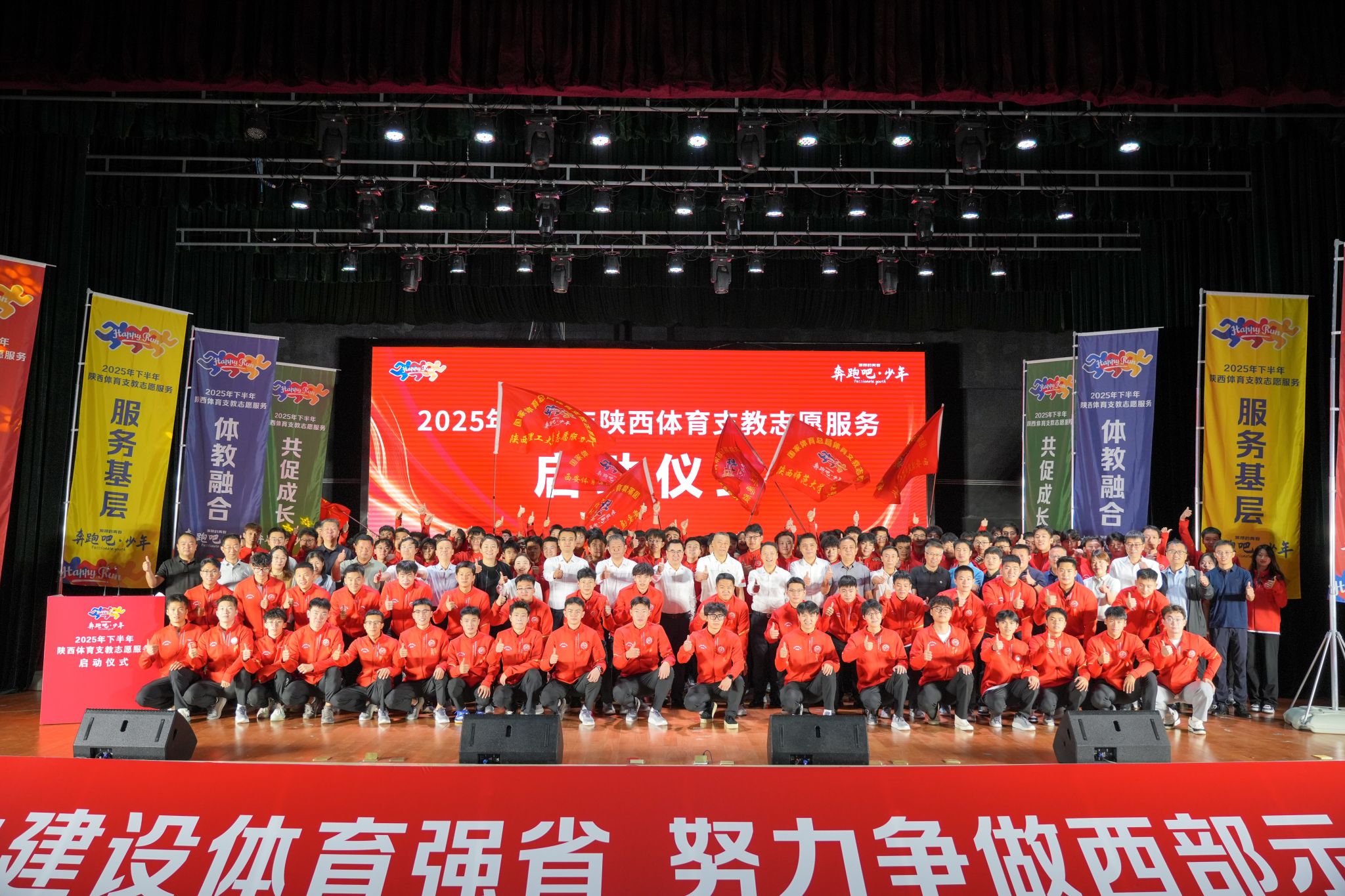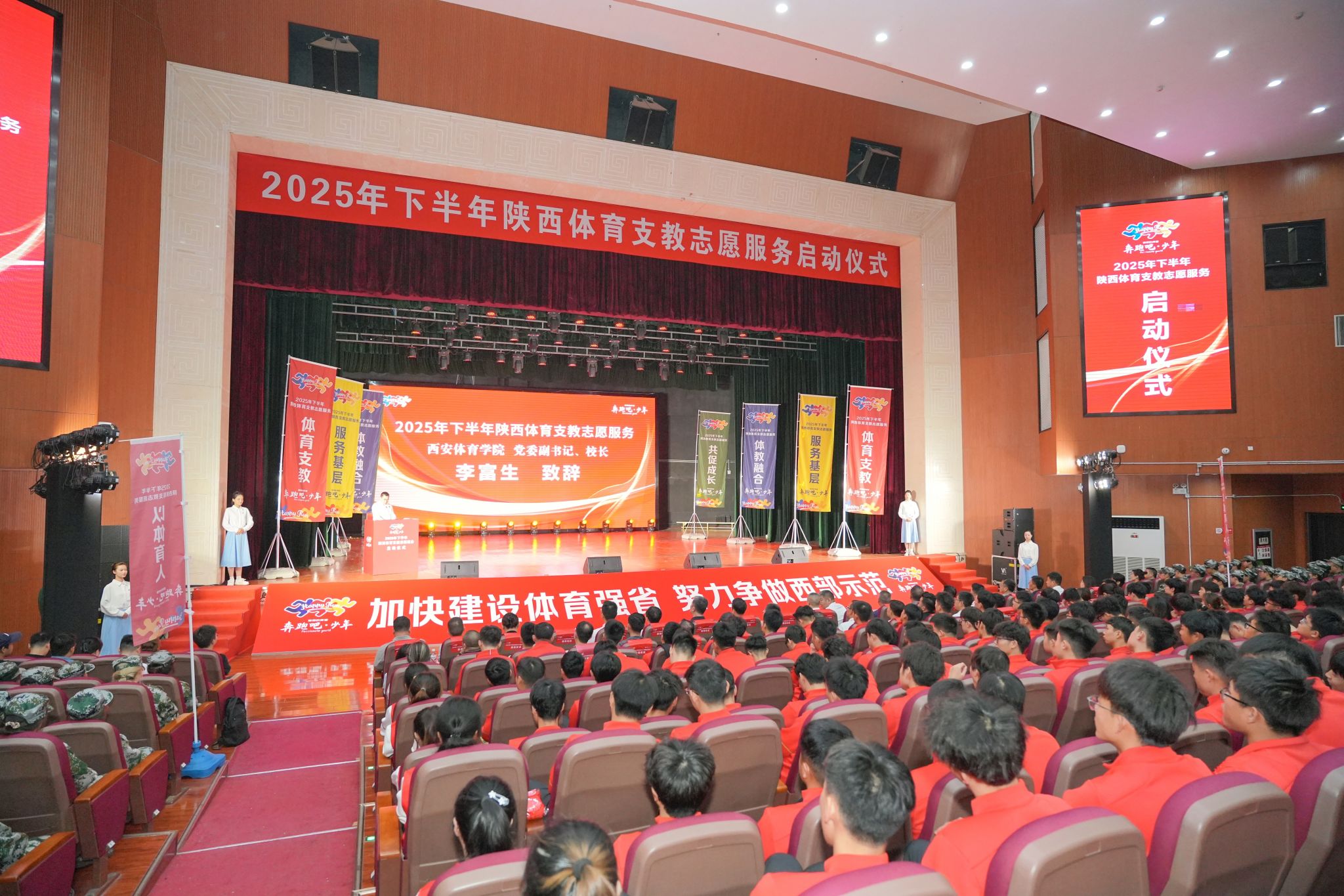 本网讯 9月14日,2025年下半年陕西省体育支教志愿服务启动仪式在必赢nn699net含光校区举行。陕西省体育局党组成员、副局长邹军,陕西省体育局青少处处长张冰、必赢nn699net校长李富生、必赢nn699net党委副书记马海涛等领导嘉宾和各支教学校、地市县支教工作负责人出席仪式。