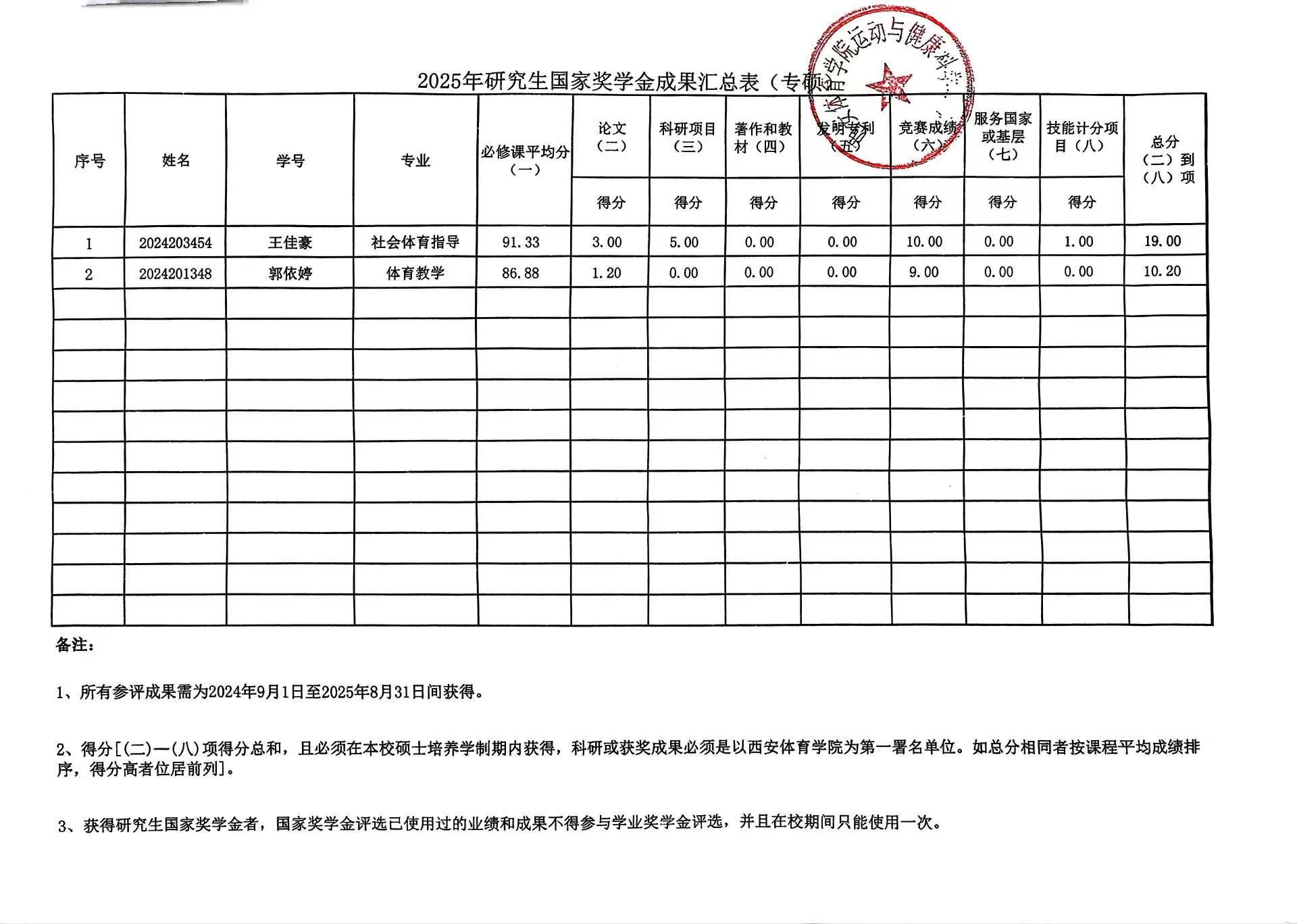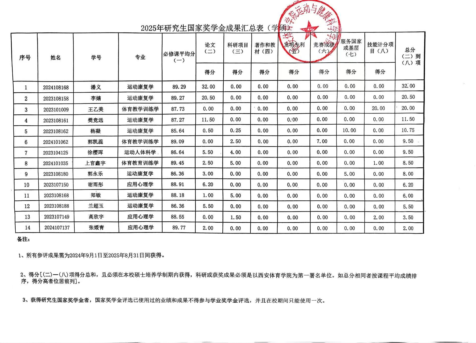 运动与健康科学学院2024-2025学年研究生国家奖学金初审合格名单公示