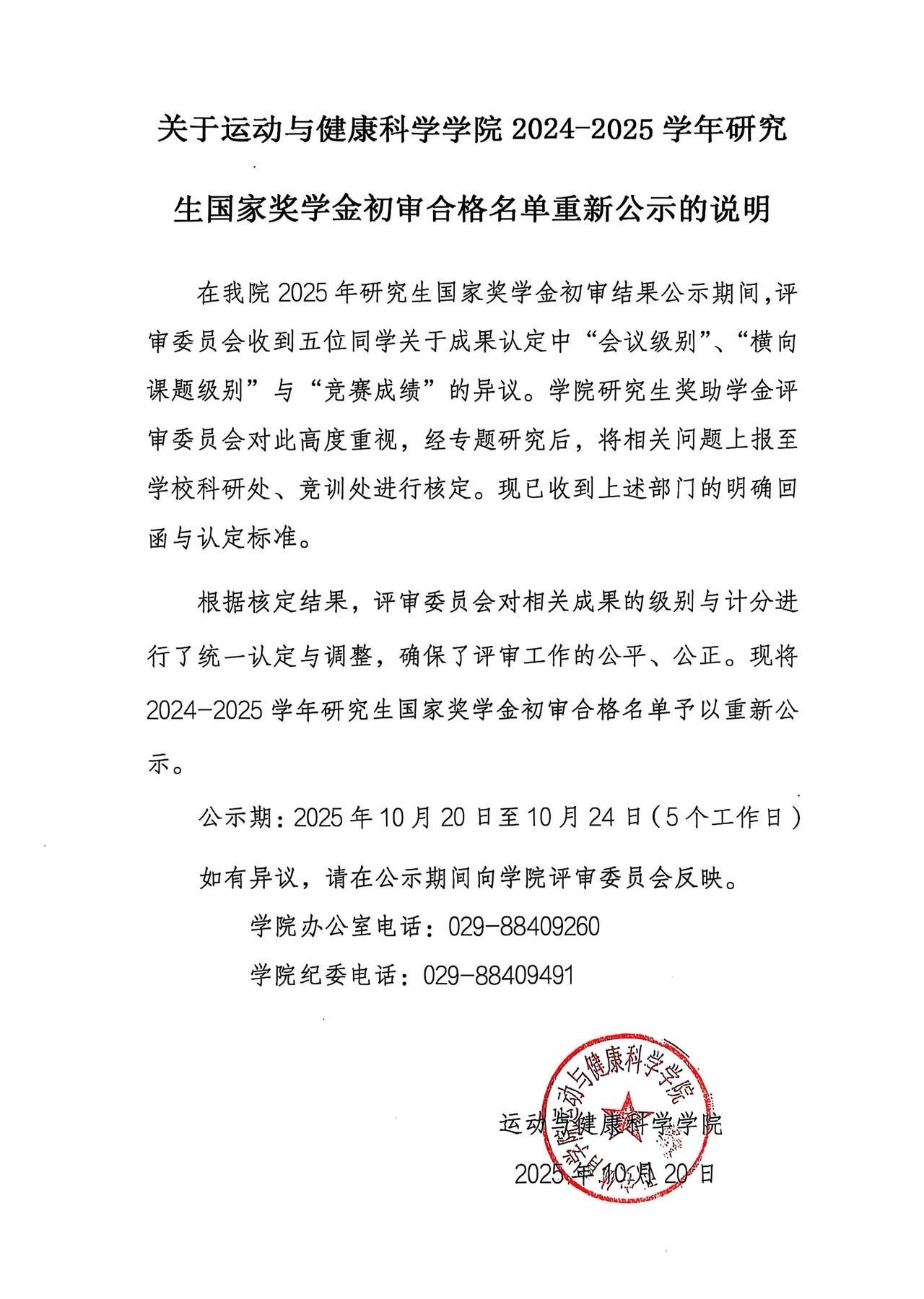 关于运动与健康科学学院2024-2025学年研究生国家奖学金初审合格名单重新公示的说明